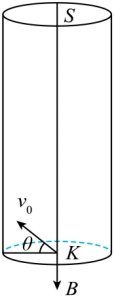。空间内存在沿真空管轴线向下的匀强磁场,磁感应强度为B。粒子从K点出发后会做螺旋上升运动,特定比荷的粒子能从上底面圆心S处射出真空管,其余粒子将被上底面吸收。已知真空管长度为L,底面半径为R,所有从K点射出的粒子均不会与管壁发生碰撞,不计粒子的重力,