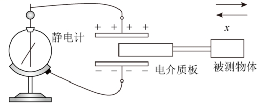 简化模型图。当被测物体在左右方向发生位移时,电介质板随之在电容器两极板之间移动,连接电容器的静电计会显示电容器电压的变化,进而能测出电容的变化,最后就能探测到物体位移的变化,若静电计上的指针偏角为