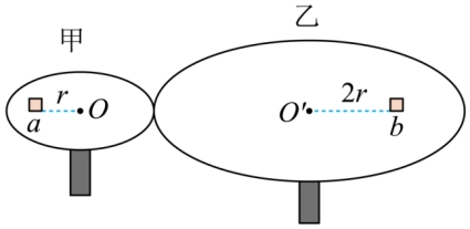 ,两小物体与圆盘间的动摩擦因数相同。a距甲盘圆心r,b距乙盘圆心2r,此时它们正随盘做匀速圆周运动。下列判断正确的是( )