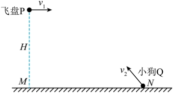 向右投掷一飞盘P,反应灵敏的小狗Q同时在M点右方水平地面上的N点以速度
