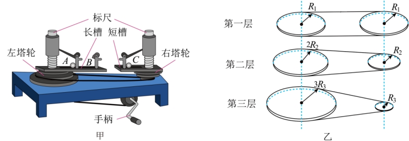 ,变速塔轮自上而下按如图乙所示三种组合方式,左右每层半径之比由上至下分别为