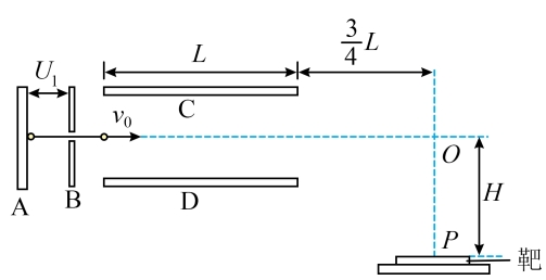 。电子从A极板附近由静止经电压加速,从B板的小孔射出,沿平行于金属板C、D的中轴线进入偏转电场后恰好从D板的右端飞出偏转电场,并打到靶台上中心点