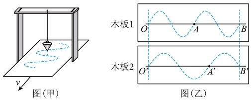 4. 如图甲是演示简谐运动图象的装置,它由一根较长的细线和一个较小的沙漏组成。当沙漏摆动时,匀速拉出沙漏下方的木板,漏出的沙在板上会形成一条曲线。通过对曲线的分析,可以确定沙漏的位移随时间变化的规律。图乙是同一个沙漏分别在两块木板上形成的曲线.经测量发现