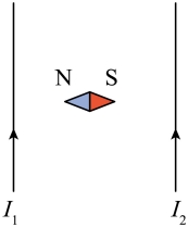 2. 如图所示,两根长直导线平行放置,在两导线间距的中点放上一枚小磁针,当两导线中分别通以同向电流I1、I2(I1>I2)时,小磁针的N极将( )