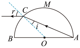 9. 如图所示,玻璃半球半径为R,球心为O,AB为水平直径,M点是半球的最高点。半球内从A点发出与AB成θ=30°的光线从BM间某点C平行于AB射出。光在真空中的传播速度为c。则( )