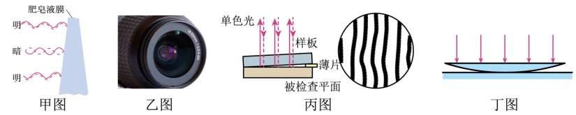 D. 如图丁所示,把一个凸透镜压在一块平面玻璃上,让单色光从上方射入,从上往下看凸透镜,由于凸透镜下表面是曲面,所以空气膜厚度越往外越厚,所以看到的明暗相间的圆环状条纹越往外越密,故D错误。