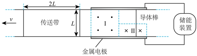 的矩形。传送带从两电极之间以速度v匀速通过,传送带上每隔2L固定一根垂直运动方向、长度为L的导体棒,导体棒通过磁场区域过程中与电极接触良好。该装置产生电动势的有效值为()