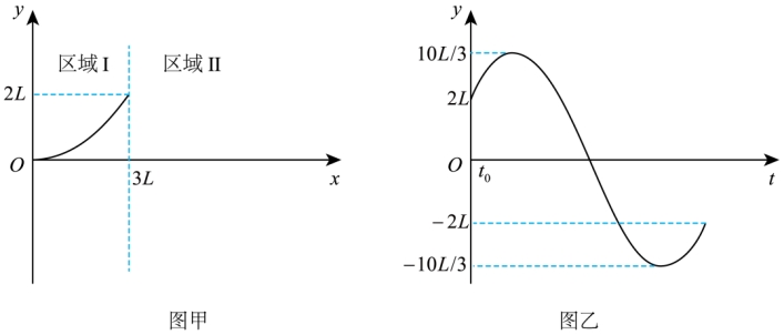 的粒子从O点沿x轴正向出发,在Oxy平面内运动,在区域I中的运动轨迹是以y轴为对称轴的抛物线的一部分,如图甲所示。