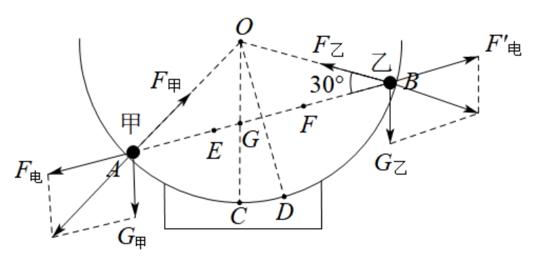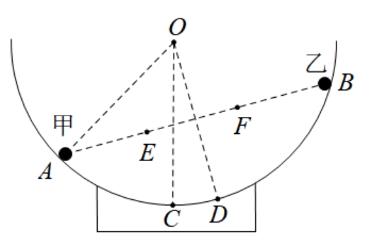 的小球甲、乙刚好静止于碗内壁A、B两点,过O、A、B的截面如图所示,C、D均为圆弧上的点,OC沿竖直方向,