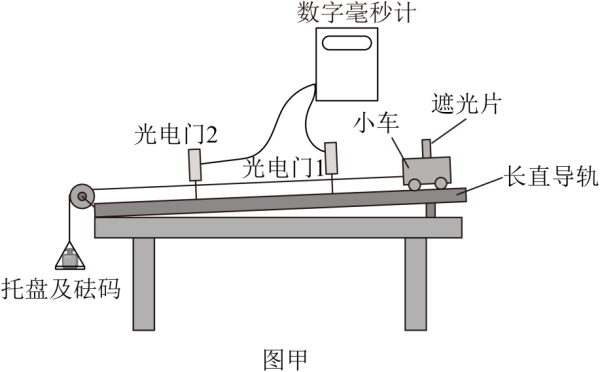 将两光电门安装在长直轨道上,选择宽度为d的遮光片固定在小车上,调整轨道倾角,用跨过定滑轮的细线将小车与托盘及砝码相连。选用
