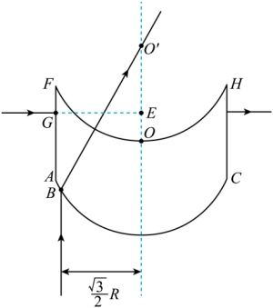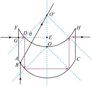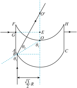 点为该光学器件上表面圆弧的圆心,则该单色光在上表面垂直入射,光路不变;因为