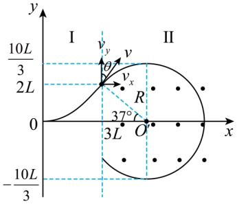 分为两个相邻的区域I、Ⅱ。区域I内充满匀强电场,区域Ⅱ内充满垂直Oxy平面的匀强磁场,电场和磁场的大小、方向均未知。