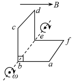 9.如图,“L”形导线框置于磁感应强度大小为B、水平向右的匀强磁场中。线框相邻两边均互相垂直,各边长均为l。线框绕b、e所在直线以角速度