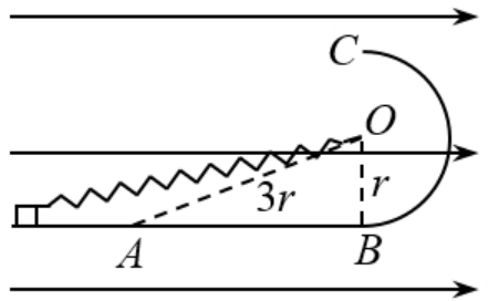 7.如图,光滑绝缘水平面AB与竖直面内光滑绝缘半圆形轨道BC在B点相切,轨道半径为r,圆心为O,O、A间距离为3r。原长为2r的轻质绝缘弹簧一端固定于O点,另一端连接一带正电的物块。空间存在水平向右的匀强电场,物块所受的电场力与重力大小相等。物块在A点左侧释放后,依次经过A、B、C三点时的动能分别为