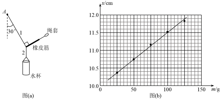 ,细绳1、2和橡皮筋相连于一点,绳1上端固定在A点,绳2下端与水杯相连,橡皮筋的另一端与绳套相连。为确定杯中物体质量m与橡皮筋长度x的关系,该小组逐次加入等质量的水,拉动绳套,使绳1每次与竖直方向夹角均为