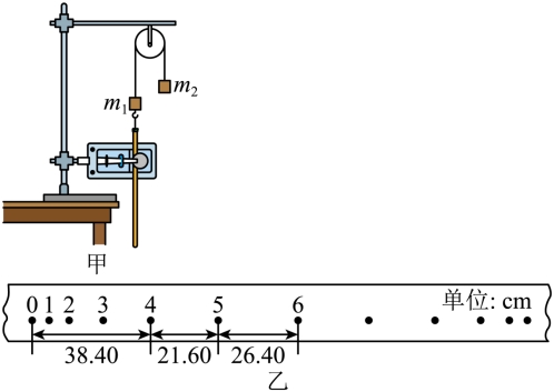 11. 用如图甲实验装置验证m1、m2组成的系统机械能守恒。m2从高处由静止开始下落,m1上拖着的纸带打出一系列的点,对纸带上的点迹进行测量,即可验证机械能守恒。图乙给出的是实验中获取的一条纸带:0是打下的第一个点,每相邻两计数点间还有4个点(图中未标出),计数点间的距离如图乙所示,已知电源频率为50Hz,m1=50g、m2=150g,g取10m/s2,则:
