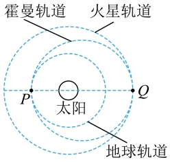 6. 如图所示,地球和火星绕太阳公转的轨道都视为圆形,霍曼轨道是近日点P和远日点Q与这两个行星轨道都相切的椭圆。当“天问一号”火星探测器到达地球轨道的P点时,变轨进入霍曼轨道,当“天问一号”运动到霍曼轨道的Q点时,再次变轨进入火星轨道。下列关于“天问一号”的说法正确的是( )