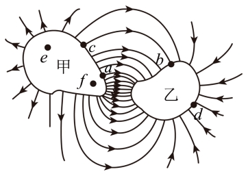 导体甲、乙带异种电荷,附近的电场线如图所示。其中a、b、c、d是导体外表面的点,e和f是甲导体内部的点。则( )