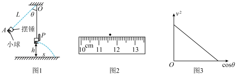 12. 小明用如图1所示装置验证机械能守恒定律。长为L的轻杆一端固定摆锤A,另一端可绕O点自由转动,在A的下方有一凹槽,内部装有一小球。现将摆锤拉起,使杆偏离竖直方向成θ角时,由静止开始释放摆锤,摆锤和小球一起向下摆动。当摆锤到达最低位置时,受到竖直挡板P的阻挡而停止运动,之后小球将飞离摆锤做平抛运动。