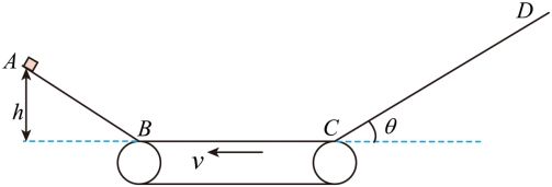 15. 如图所示,AB为光滑倾斜轨道,BC为一逆时针匀速转动的水平传送带,CD段是一个可以改变倾角的长斜面。AB之间高度h=1.25m,BC之间距离L=4m,传送带速度v=4m/s。物体与传送带之间动摩擦因数μ1=0.2,物体与斜面间动摩擦因数