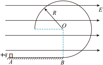 16. 如图所示,AB是长为2R的水平粗糙轨道,B点与一半径为R的光滑圆轨道相切,整个空间有一水平向右的匀强电场。一带电量为+q、质量为m的小物体从A点由静止释放,经过B点时对圆轨道的压力为其重力的2倍。物体与水平轨道的动摩擦因数