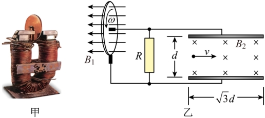 15. 图甲是法拉第发明的铜盘发电机,也是人类历史上第一台发电机。利用这个发电机给电阻和平行金属板电容器供电,如图乙所示。已知铜盘的半径为