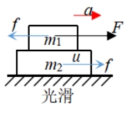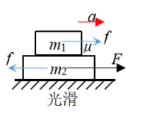 1.a加速度判断 m1最大加速度a1max=μg m2加速度a2=(F-μm1g)/m2 2.分离条件 a2>a1max即F>μg(m1+m2) 3.不分离条件 a2≤a1max即 F≤μg(m1+m2) 整体加速度a=F/(m1+m2),内力f=m1F/(m1+m2) | 1.a加速度判断 m2最大加速度a2max=μm1g/m2 m1加速度a1=(F-μm1g)/m1 2.分离条件 a1>a2max即F>μm1g(1+m1/m2) 3.不分离条件 a2≤a1max即 F≤μm1g(1+m1/m2) 整体加速度a=F/(m1+m2),内力f=m2F/(m1+m2) |