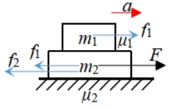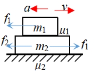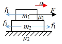 1.保持静止 F≤μ2(m1+m2)g 2.一起加速 μ2(m1+m2)g<F≤(μ1+μ2)g(m1+m2) 整体加速度a=[F-μ2(m1+m2)g)]/(m1+m2) 内力 3.分离 a2>a1max=μ1g 即F>(μ1+μ2)g(m1+m2) | 1.保持静止 F≤μ2(m1+m2)g 2.一起加速 μ2(m1+m2)g<F≤(μ1-μ2)m1g(1+m1/m2) 整体加速度a=[F-μ2(m1+m2)g)]/(m1+m2) 内力f1=μ2(m1+m2)g+m2a= 3.分离 a1>a2max=[μ1m1g-μ2(m1+m2)g]/m2 即F>(μ1-μ2)m1g(1+m1/m2) |