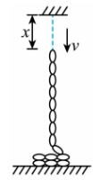 在细绳下落的过程中,台秤的示数来自于两部分:台秤上静止细绳的重力+细绳与台秤的冲击力F。当细线下落x时,台秤的示数为: