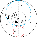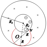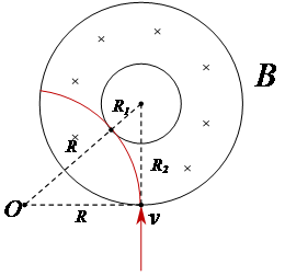 如图,环形磁场内圆里有质量为m,带电荷量为e的电子(不计重力),以任意方向大小的速度进入环形磁场,磁场磁感应强度大小为B,通过分析电子在磁场中运动轨迹,由几何关系可知
