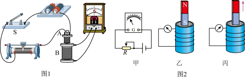(3)G为指针零刻度在中央的灵敏电流表,连接在直流电路中时的偏转情况如图2甲所示,即电流从电流表G的左接线柱进入时,指针也从中央左偏。今把它与一线圈串联进行电磁感应实验,则图乙中的条形磁体的运动方向是向______(选填“上”或“下”);图丙中的条形磁体下端为______(选填“N”或“S”)极。