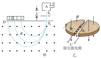 C.图乙,粒子在两个半圆金属盒的缝隙中的电场中加速,故C错误;