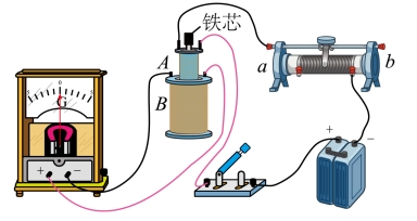 B.滑动触头向右滑动时,滑动变阻器接入电路的电阻变小,流过线圈A的电流变大,线圈A产生的磁场增强,穿过线圈B的磁通量增加,则灵敏电流计的指针右偏,B正确。