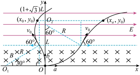 (3)若粒子a、b同时离开磁场,求两粒子从O点发射的时间差,以及粒子b在电场中经过