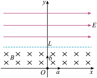 发射带正电粒子a、b,两粒子质量均为m,电荷量均为q。粒子b离开磁场时的速度与x轴负方向的夹角为