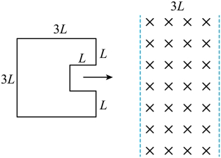线框离开磁场L~3L时,金属线切割磁感线的有效长度为3L,从右侧中间短边离开磁场,至左侧长边离开磁场,感应电流方向为顺时针,大小为